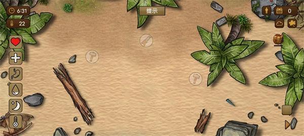当左侧第三个图标呈现红色时,意味着角色处于饥饿状态,玩家可打开背包,先进食补充体力;此外,玩家也能点击画面上的绿点开展探索活动。