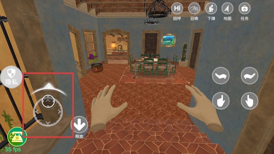 通过左侧的【摇杆】来操控角色移动,探索室内的各个场景,并配合手势按钮来完成互动操作。