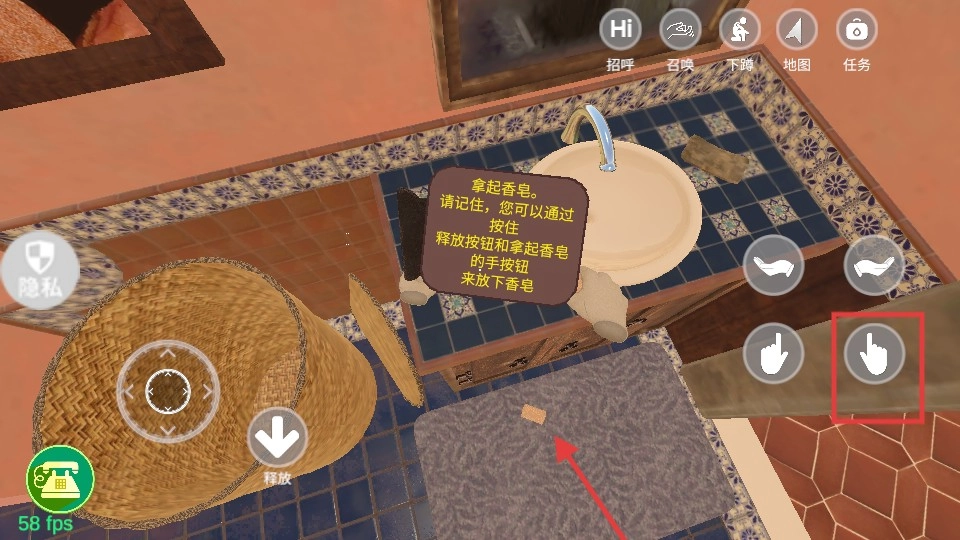 按照提示操作右侧的【手形按钮】来拿起香皂,为“帮她洗头”的任务做准备,物品的操作方式是按住后再释放。