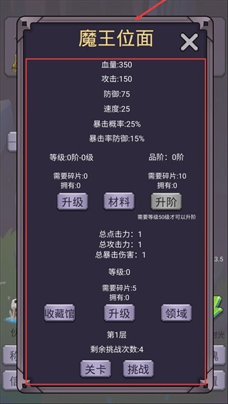 1、进入【魔王位面】界面后,先通过点击【升级】按钮来提升血量、攻击等基础属性,待积累足够碎片后,再使用【升阶】功能进一步增强战力,以此为后续的挑战做好准备。