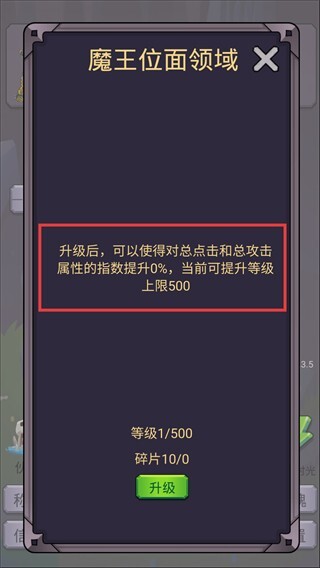 2、进入【魔王位面领域】后,通过升级能够提升总点击与总攻击属性,该领域的等级上限为【500】,建议优先进行升级来增强战斗输出能力。