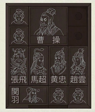 2、左底角兵右移,右底角兵左移,张下移,黄下移,关右移,中左兵左上移,底中兵上移两步。
