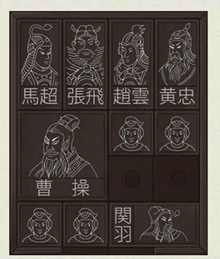 8、张下移,马下移,中路兵向左移两格,曹下移,左上角兵向右移两格,中路上方兵向上右移动,中路下方兵向上移两格,张上移两格,马左移,中路兵向左下移,曹下移。