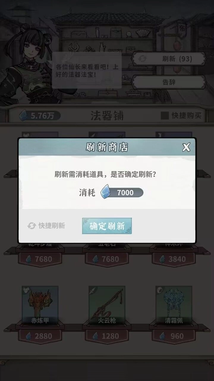 刷新一次需要1000灵石,第二次是2000灵石,之后每次刷新的消耗都会按这个规律递增。这里提醒大家,刷新的时候要控制次数,别轻易用快捷刷新功能,不然可能没留意就把家底都搭进去了。要是灵石比较多,可以先买灵茶;如果还有富余,也可以去白塔镇秘宝阁买个宝箱试试运气,这都比单次刷新就要花一万灵石划算得多。很多新手容易把钱都砸在白塔镇,结果到后面就没钱用了。