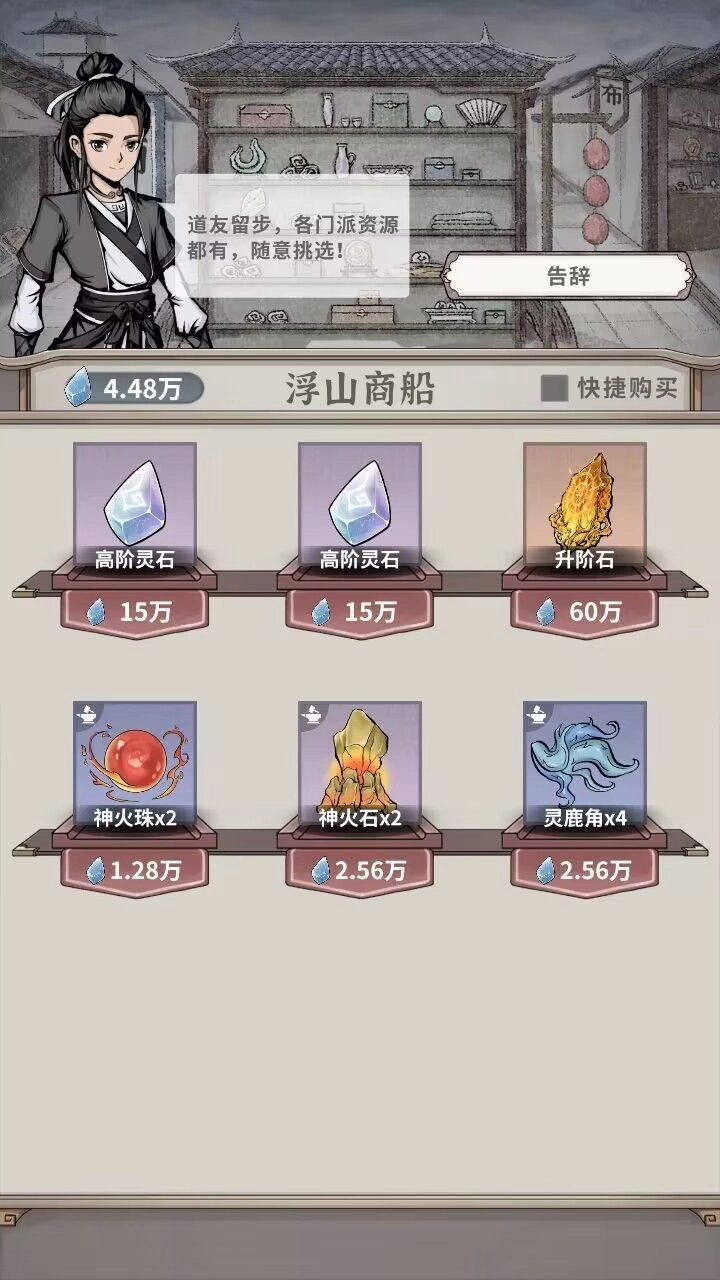 在驿站歇到清晨,浮山集会那边会有御剑的道童;要是没遇到,那就在白塔镇找找看(要是两处都没瞧见,那就可能在路上了)——那里有打折的高阶灵石(材料价格不算低,手头宽裕的话只推荐买15万的那种),或者等之后刷塔攒够钱了,记得每天都来买高阶灵石。