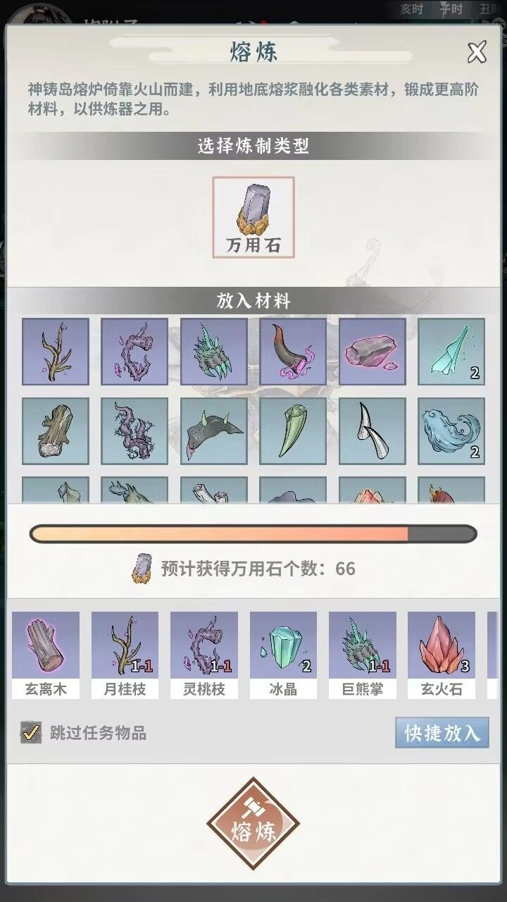 等解锁到六阶之后,多余的材料可以熔炼成万用石,用来打造六阶装备。不过炼器等级单是升到六阶就得花好几天时间(注意别把任务物品用掉,不然每天做宗门任务还得额外刷怪)