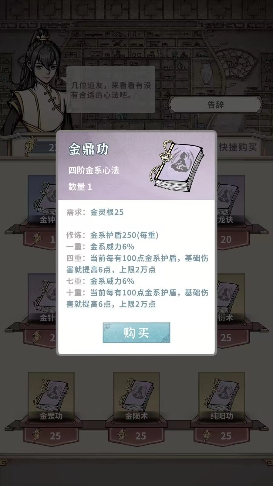 金鼎功:有金系护盾提高伤害(25金灵根)