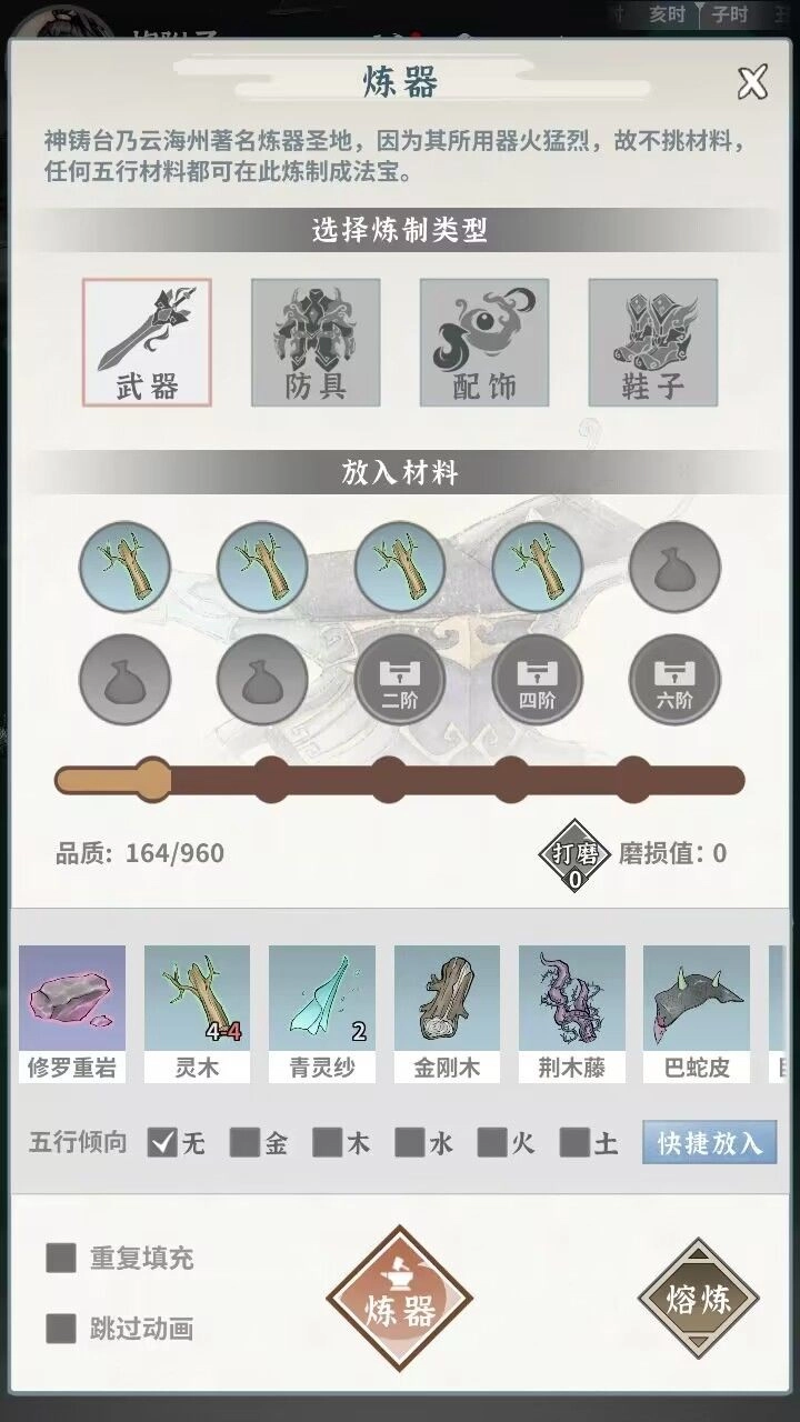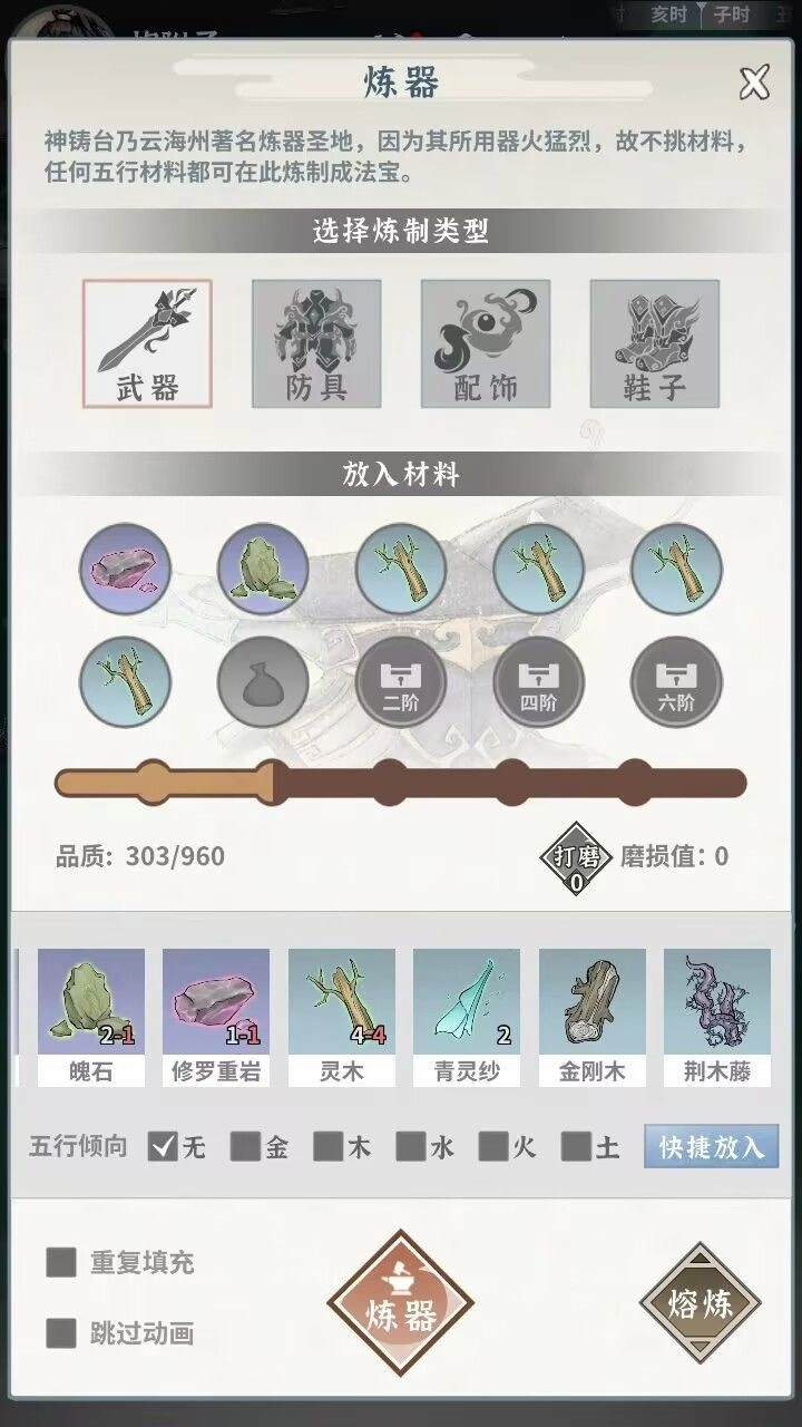 建议在炼器二阶阶段刷经验。五行倾向选择“无”的话,刚好能炼制二阶青木鼓和二阶绛黄织。炼制过程中有几率得到品质不错的成品,后续可以用活动奖励将它们升级到六阶;而且这些装备增加的会心几率和会心伤害,师弟们也都能通用,所以需求相对来说还是比较大的。