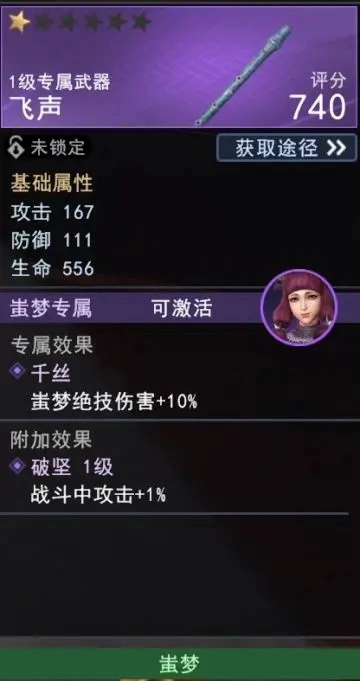 极品武器:飞声。其专属效果为千丝,可使绝技伤害提升10%;附加效果是破坚,能让战斗中的攻击增加1%。