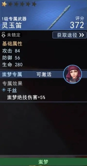 蚩梦的专属绝品武器是万蛊噬心笛,它拥有专属效果千丝,能使绝技伤害提升15%,还具备附加效果破坚,可让战斗中的攻击增加2%。