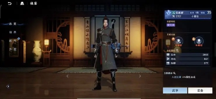 第二部分是装备,装备带有属性加成,玩家可以依据装备的属性为侠客进行搭配。