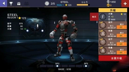 1、启动游戏后,玩家能够拥有多台战斗机器人,而初始获得的第一台机器人正是《铁甲钢拳》中的主角亚当。在开启正式战斗之前,我们需要先对装备进行简单的升级操作。待装备升级完成,就可以开启职业战斗模式了!