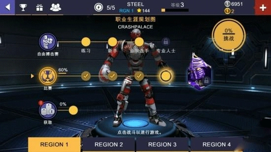 2、点击地图后,会看到三个主要分类:自由搏击、比赛以及获取(氪金玩家的必备选项),其难度是依次递增的。其中自由搏击的核心作用是帮助玩家熟悉游戏操作,以便他们能更快地上手游戏。