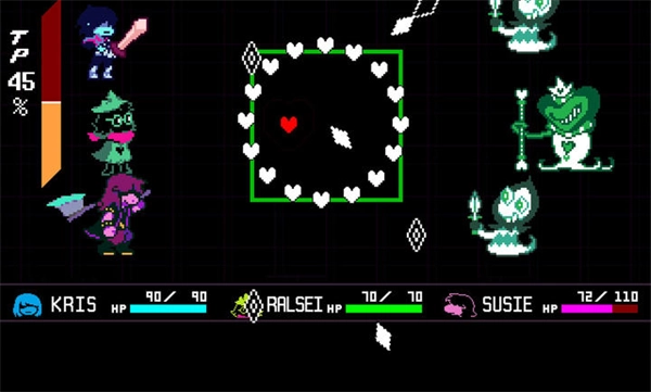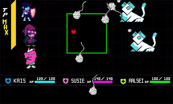 2、遭遇敌人袭击时,切换至弹幕躲避界面,角色将以心形态进行闪避操作,同时通过擦弹机制积累TP值。