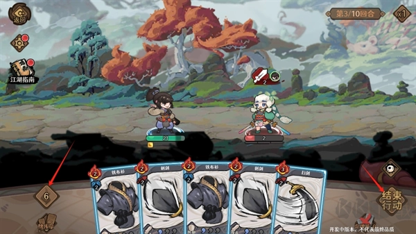 第二关是谭腿试炼,在这个关卡里我方可以选两个武侠出战,武学卡牌主要包含谭腿、刺剑和落尘重剑这几个招式。玩家使用武学时,先以落尘重剑发动群体攻击,接着循环使用谭腿与刺剑进行攻击,就能较快完成关卡挑战。