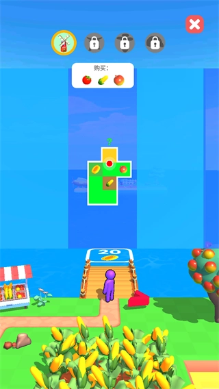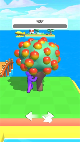 操作紫色角色摇树,收获苹果,积累水果资源。