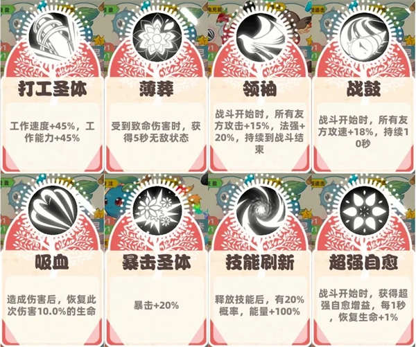 -闪光:会提供一个额外技能,其中比较实用的有适合过渡的【打工圣体】,以及【领袖】【薄葬】【战鼓】;【吸血】【暴击圣体】【技能刷新】也能派上用场,而【超强自愈】目前还只是个摆设。