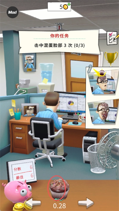 在办公室捣蛋鬼汉化版中,拥有丰富关卡挑战等你体验,每一个关卡都有不同的道具提供给你使用,当你用道具正中同事的头部时还可以将其眩晕,通过关卡后就可以在任务清单列表里领取到丰厚的金币奖励啦。