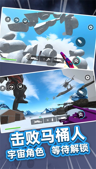 4、背景的融合:奇特的荒野背景与厕所怪物背景相互融合,武器库中配备了各式各样的怪异道具、图形以及各类武器,供您挑选。