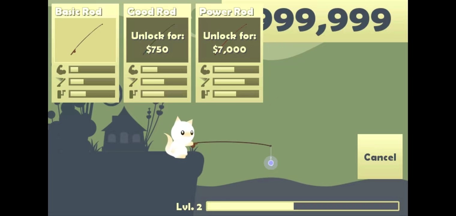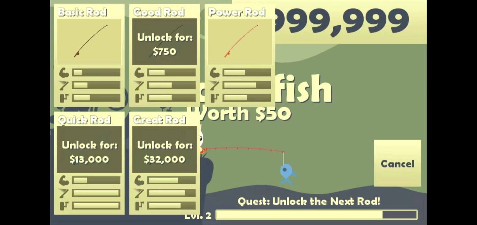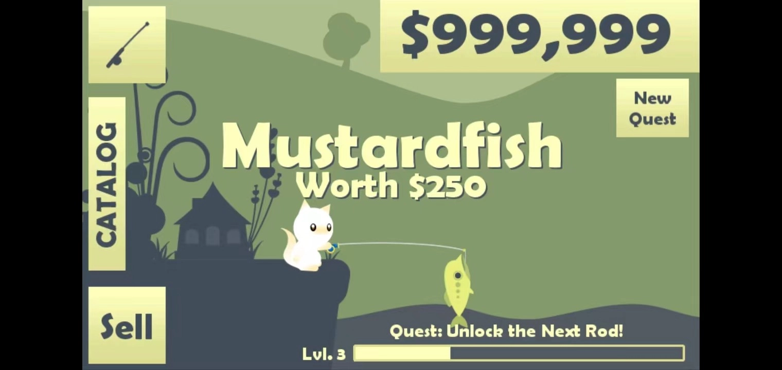 4、获得一定的金币后,你可以购买渔具,点击左上角的【渔具】按钮即可,这样你的鱼钩能抛到更远的地方,钓到更多的鱼。