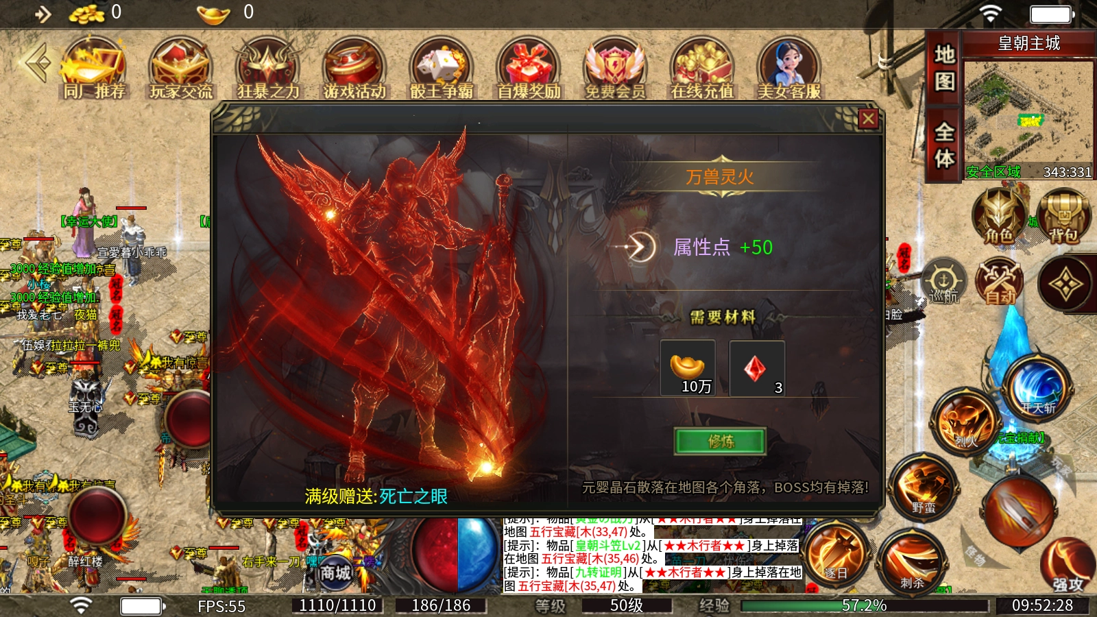 神秘异火系统:消耗元婴晶石与元宝即可提升异火等级,从而获取属性点。元婴晶石在地图各处均有分布,所有BOSS也会掉落该道具!
