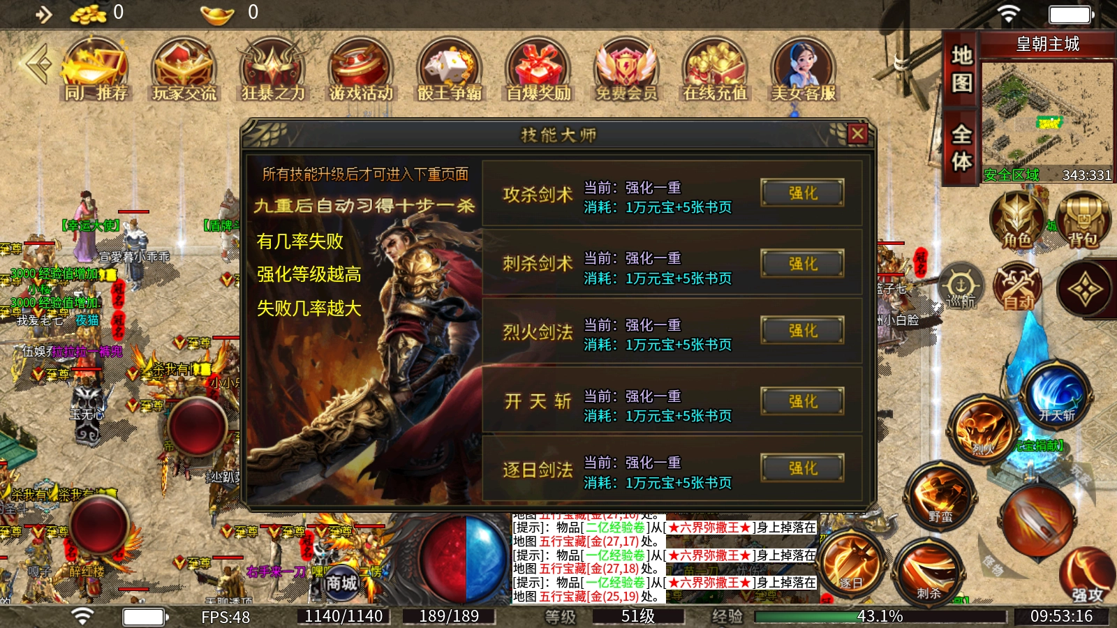 技能大师:所有技能都能通过消耗书页和元宝来强化,强化过程存在失败概率,而且强化等级越高,失败的可能性就越大!