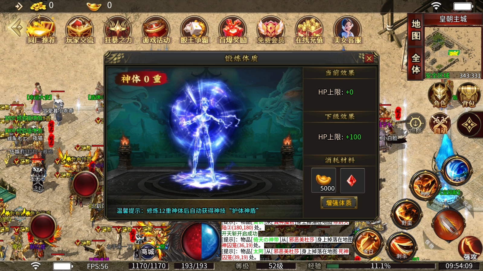 锻炼体质:消耗元婴晶石与元宝,即可对体质进行锻造,以此提升自身的血量上限。当修炼至12重神体后,将自动解锁神技“护体神盾”。