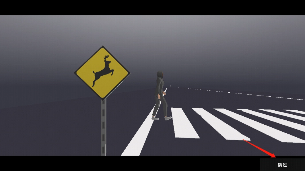 3、随后便会进入一段剧情,此时玩家能够点击右下方的【跳过】按钮。这段剧情大致是,刚刚精心捏制好的角色,为了拯救一头鹿,不幸被车撞到。就这样,我们自然而然地化身成为了那头鹿,开启了全新的“鹿生”。在此,先让我对刚捏好的主角表示一下缅怀之情吧……