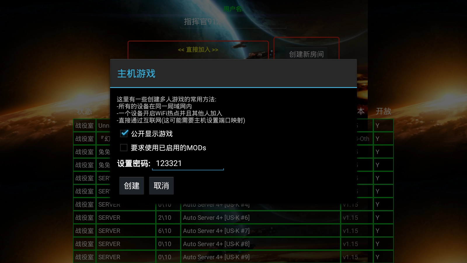 4、进入房间设置后,记下上方的公共IP地址与端口,将IP和端口发给好友,即可开始游戏。