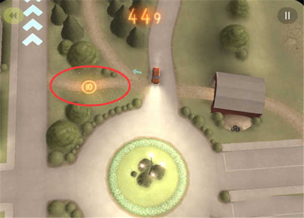 6、在游戏里开车时,能看到地上有写着10的圆圈图标以及写着20的圆圈图标,这些图标代表分数。要是不会发生撞车情况,最好去获取一下这些分数。