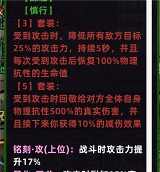 每次受到攻击,全体怪物攻击力降低25%,同时自身回复等同于100%物理抗性数值的生命值,并向全体怪物反弹相当于自身500%物理抗性的真实伤害,此外还能获得10%的减伤效果。