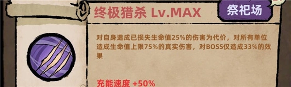 技能剖析:损失25%的血量,对全体怪物造成相当于其75%生命值的真实伤害,而对boss仅能产生33%的此效果。