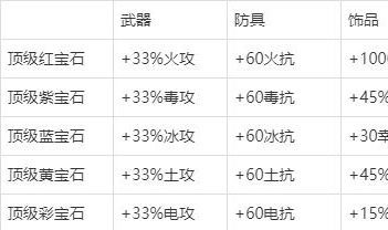 以下表格展示的是顶级宝石所具备的附加属性: