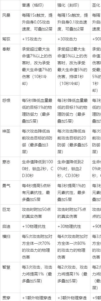 符文等级:符文分为3种等级,分别是普通(烙印)、强化(刻印)以及圣化(符文)。每3个低等级符文能够借助铁匠铺的锻造功能,合成为高一个等级的符文,合成成功率为100%。各等级符文属性加成效果如下表所示: