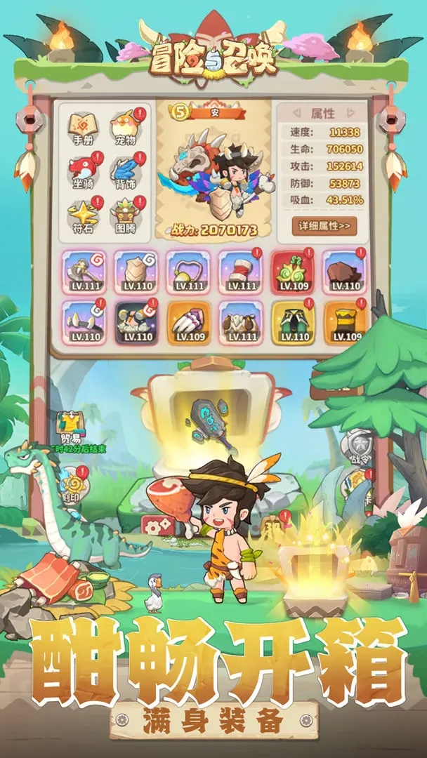 冒险与召唤是一款以石器时代为背景的策略放置角色扮演游戏。在游戏中,玩家将穿越到一个石器的时代,作为一个原始人,与在这个给世界中的各种怪物进行战斗,体验一个真实的石器时代。游戏中具备多样的玩法,玩家可以建立自己的家园,在这里享受经营的趣味,也可以不断的进行闯关,不断的收获更加强大的装备,享受肉鸽游戏的乐趣。随着战力的提升,玩家也将解锁更多的宠物,他们能够帮助玩家更好的完成自己需要的战斗。