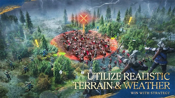 4、【善用拟真天气与地形】在广袤、鲜活且逼真的中世纪世界中展开探索与征服之旅,领略随季节更迭且变幻莫测的天气。不同的天气状况与多样的地形,都将左右你的战略抉择。暴雨与干旱会重塑地面景观,对行军速度产生影响。闪电会对军队及建筑物造成损害,而浓雾会遮蔽视线,使你难以看清或许隐匿于雾中的敌人。若能巧妙地借助天气与地形,便可提高战斗效率!