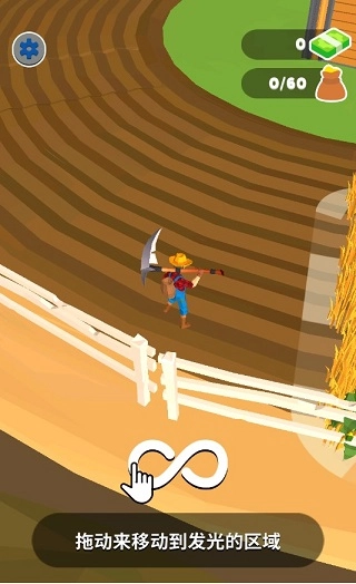 1新手玩家请注意,在游戏中,你只需拖动手机屏幕,将角色移动至发光区域,这个区域就是图中所标注的农场位置。当角色进入指定区域后,农民伯伯便会自动开始收割庄稼。现在,请你依照教程要求,收获60个农作物并放入你的口袋。