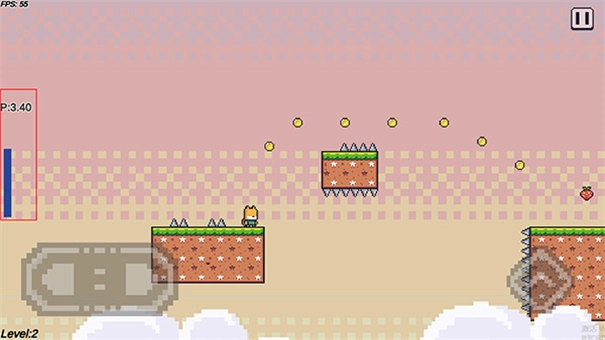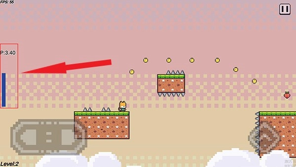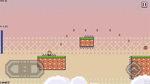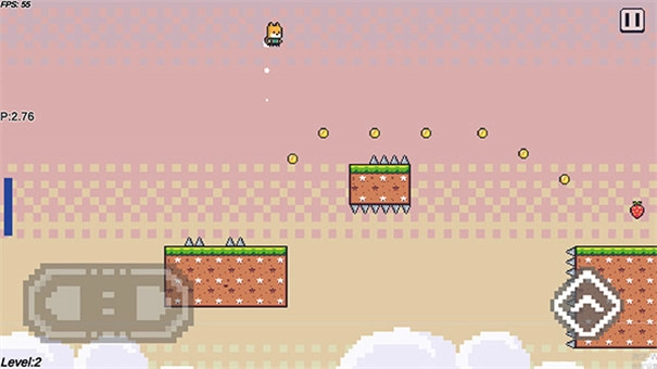2、长按跳跃键就能触发喷气效果,使小狐狸飞起来。此时,玩家要把控好方向,去收集上方的金币,要是能收集到草莓,便可顺利通过关卡。
