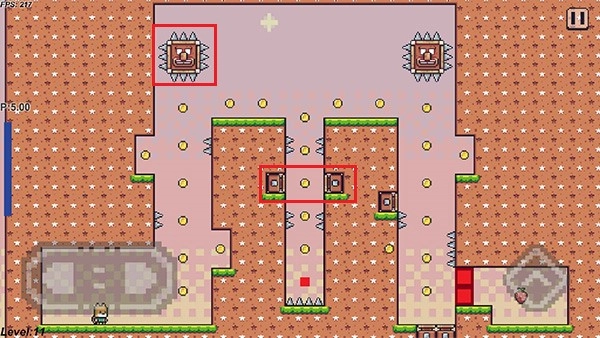 4、游戏关卡中存在各类障碍,像尖刺之类的,千万不要触碰到它们,不然就会闯关失败,得重新开始挑战关卡。