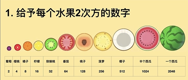 2在2048游戏中,需将呈2次方的数字相邻放置。这款游戏不仅要关注数字,还得兼顾水果的面积,这就如同在2048原本的玩法基础上增添了面积方面的考量。首先,我们要给水果附上一个2次方的数字。