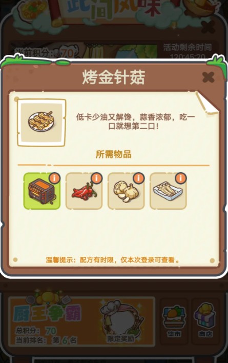 3. 乐缤纷庄园的菜谱汇总分享烤金针菇的制作要素为:烤箱,搭配辣椒、蒜以及金针菇。