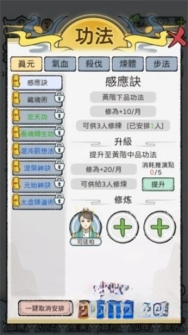 3、选定图腾后,点击“功法”按钮,为角色规划修炼的功法。