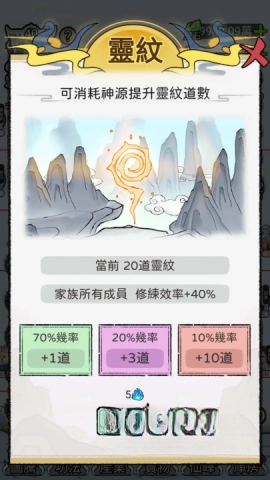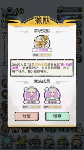 2、玄鉴:解锁24种功法,专注于族人攻击力。