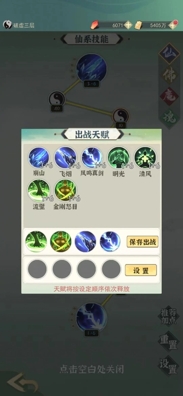 当角色达到元婴阶段后,天赋点数相对充裕,此时可选择仙系天赋。首先,将仙一天赋提升至三级。随后,着重加点被动天赋中的攻击属性以及攻击百分比属性。当累计点满29个天赋点时,开启仙三天赋的加点。接着,主要对速度以及速度百分比相关天赋进行升级。待天赋点数达到40个后,再去点击仙四天赋。需要注意的是,除仙一主动天赋外,其余主动天赋均只需点击一次即可。