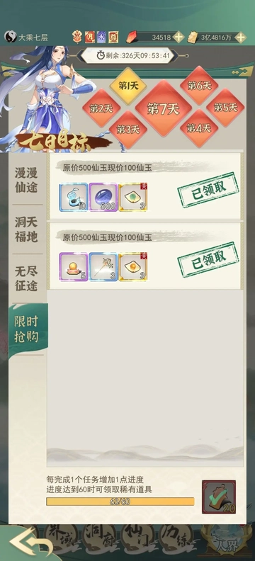 当解锁人界之后,点击进入活动界面,从中找到开服福利板块,在第一天的时候,能够花费100仙玉来购买5个中级经验丹。另外,在机缘当中,那些需要用仙玉购买的徽记,玩家可以选择不买。