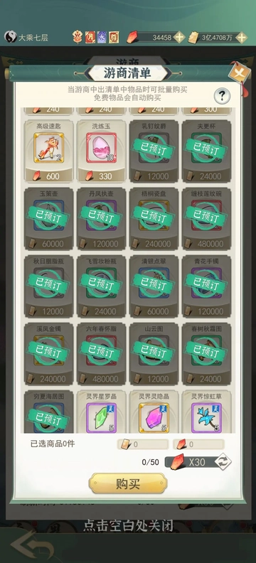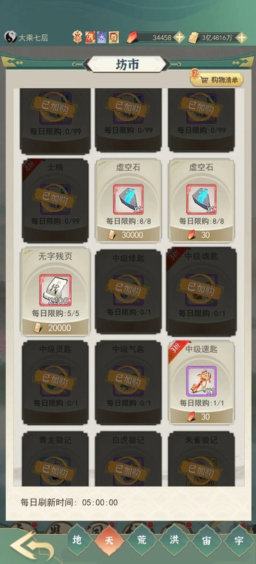 ③在坊市购买:各类丹药、人间惊虹草、人间含光草、四把钥匙、四种徽记以及书页。五行灵精尽量买满,这样到了灵界就能炼丹。前期虚空石也需拉满。