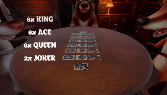 牌面构成如下:包含6张A、6张K、6张Q以及2张王(王具备替代其他牌的功能)。