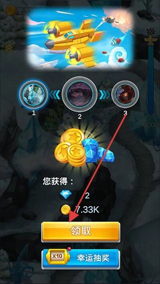 游戏内设有奖励领取页面,玩家在通过关卡后,会得到相应的金币(7.33K)和钻石(2),点击“领取”按钮即可获得这些奖励。此外,该页面还提供“幸运抽奖”功能,玩家可利用此功能对飞机进行强化,从而助力游戏进程的推进,这一设计体现了游戏的养成体系与奖励规则。