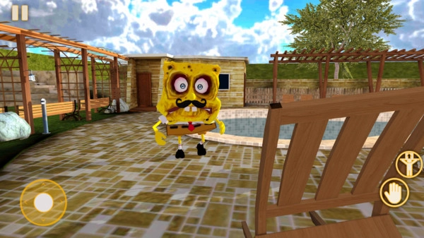 要小心避开那个坏邻居,它长得像海绵宝宝,一旦被它抓住就糟了。可以借助周围的物品,或者躲到柜子里、床底下这些地方来藏起来。