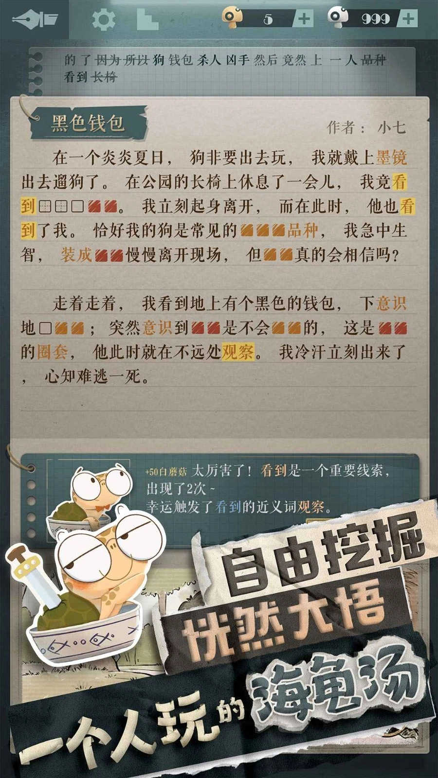 海龟蘑菇汤正版是一款别具一格的推理解谜手机游戏!它凭借引人入胜的故事剧情与精妙的玩法设计,为玩家带来了全新的推理体验。游戏中的每个故事都像一个微型谜题,玩家需要通过推理和猜想逐步揭开背后的真相,这一过程不仅考验着语言表达能力,更对逻辑推理能力与思维敏捷度提出了挑战;对于热衷于推理解谜类游戏的玩家而言,海龟蘑菇汤最新版绝对是不容错过的选择!